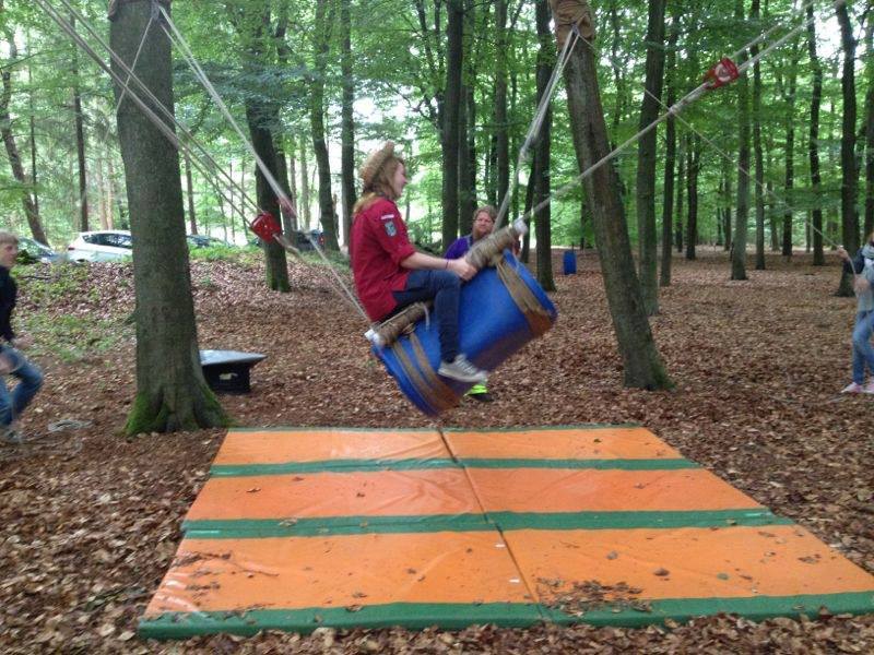 Beeld van een zelfgemaakte rodeostier van een ton, touwen en een set katrollen
